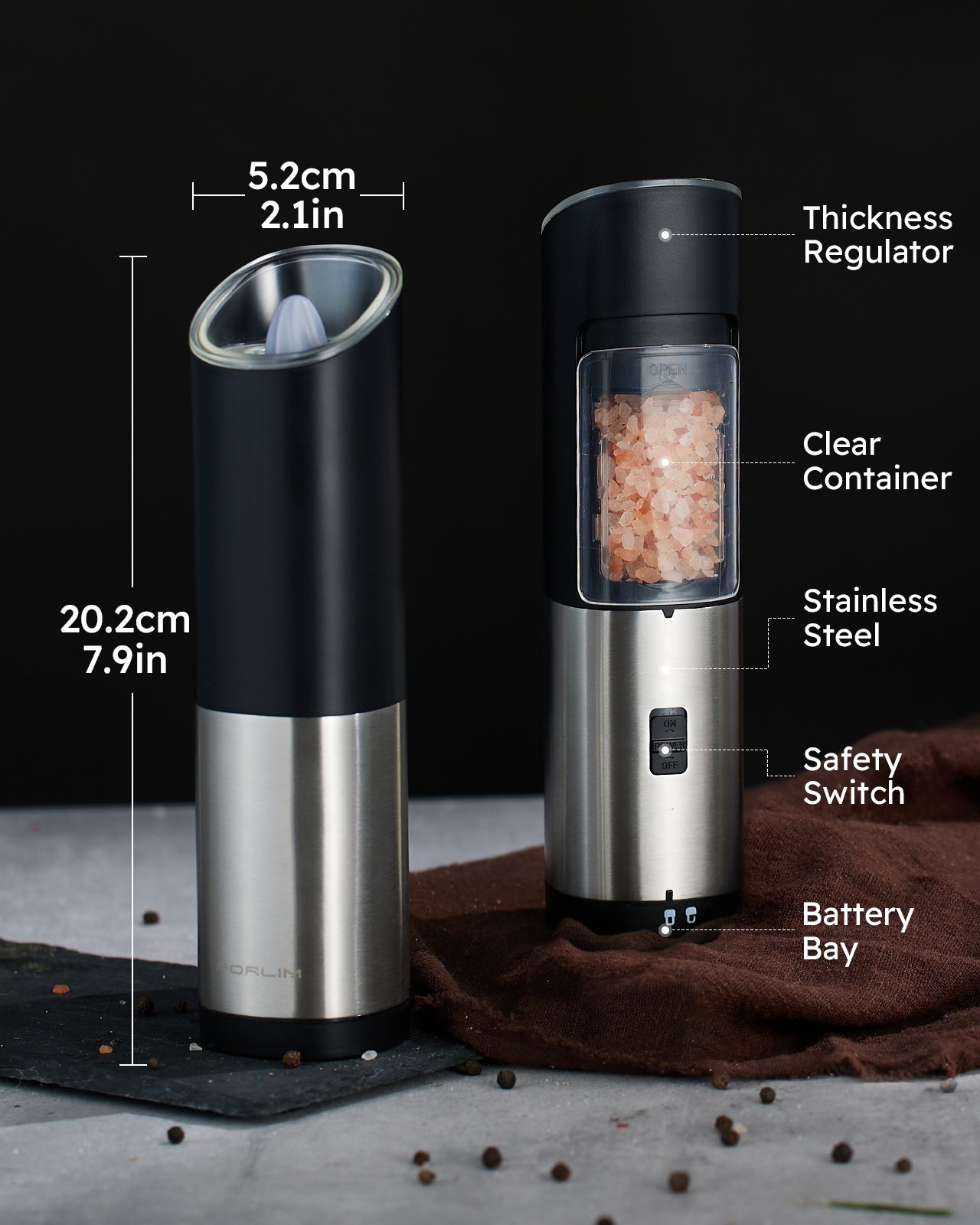 - [Hassle-Free Cleaning]: Say goodbye to the hassle of cleaning hard-to-reach spots! FORLIM Electric Salt and Pepper Grinder features a convenient side opening storage that allows for easy cleaning with a brush. Keep your grinder in pristine condition without any effort. Just a quick brush and it's good to go! Note: Avoid using water to wash to protect the motor from damage.
