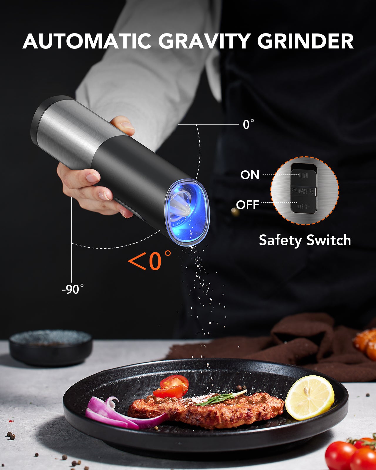 - [Customize Your Seasoning]: Our electric grinder puts the power of flavor in your hands, allowing you to easily adjust the coarseness of your salt and pepper by simply twisting the knob. Whether you want a fine dusting or a bold, coarse grind, this gadget ensures that you get the perfect seasoning for every dish, every time. Say goodbye to bland meals and hello to a world of delicious, customized flavors!